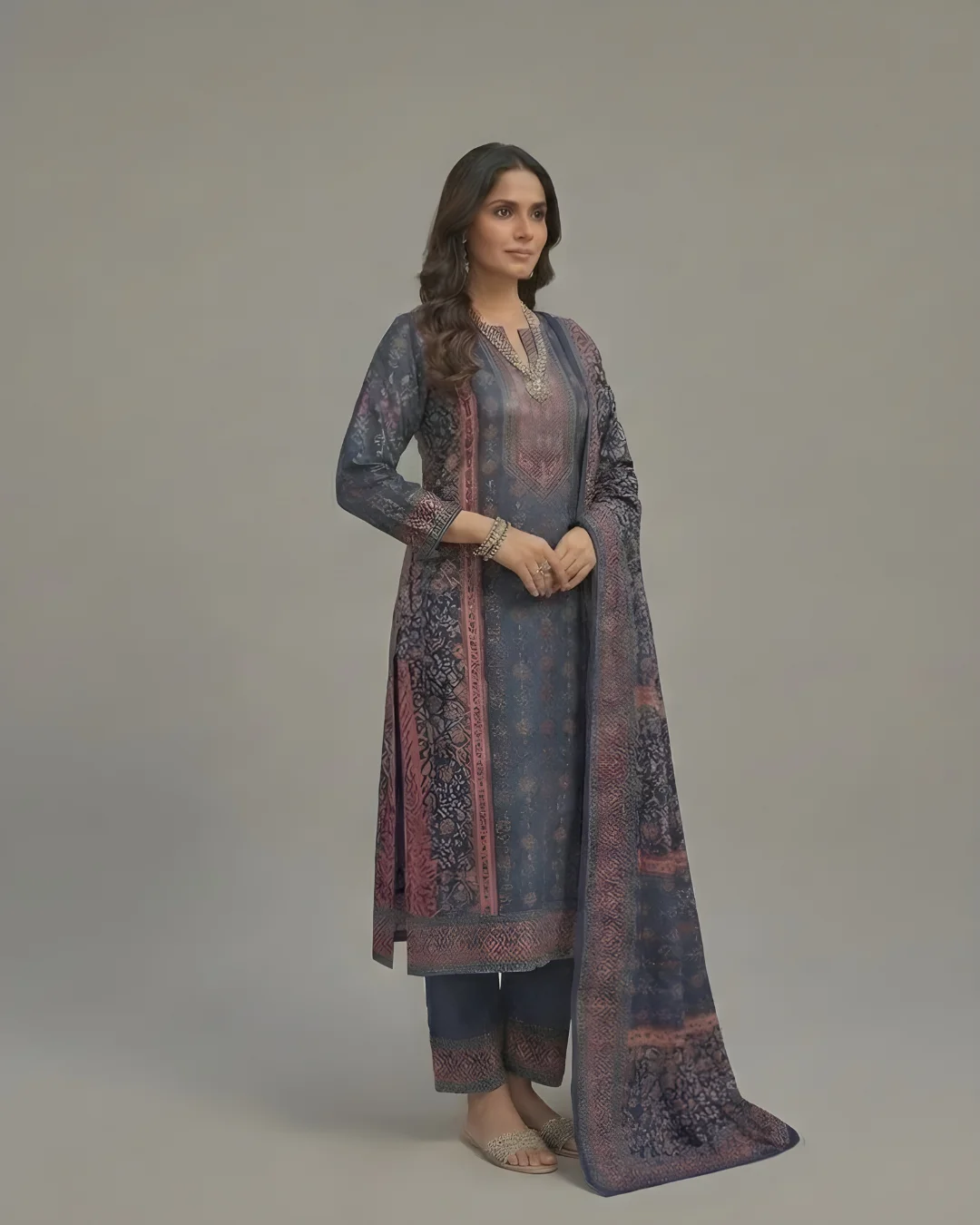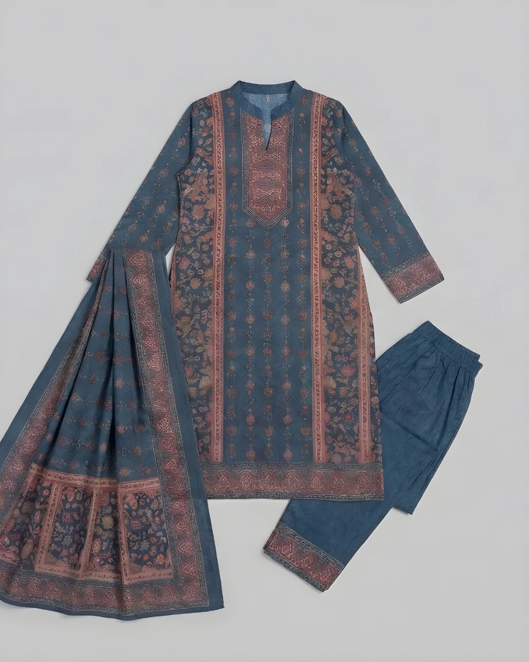 The beautiful traditional print gives a classy ethnic appeal, making it perfect for festive occasions, family gatherings, office wear, and winter outings. This ready-to-wear stitched suit saves time and ensures a flattering fit.